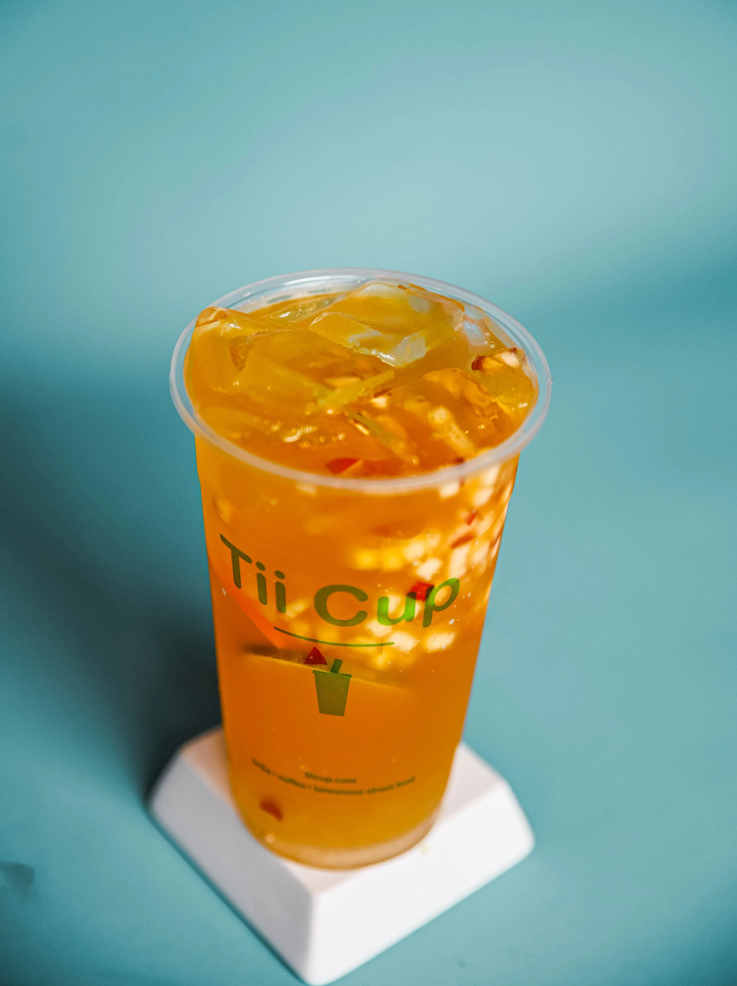 A part of Tii Cup's special drink menu, passion fruit paradise with fresh apple bits, aloe jelly, chia seeds, and fresh lime & orange slices