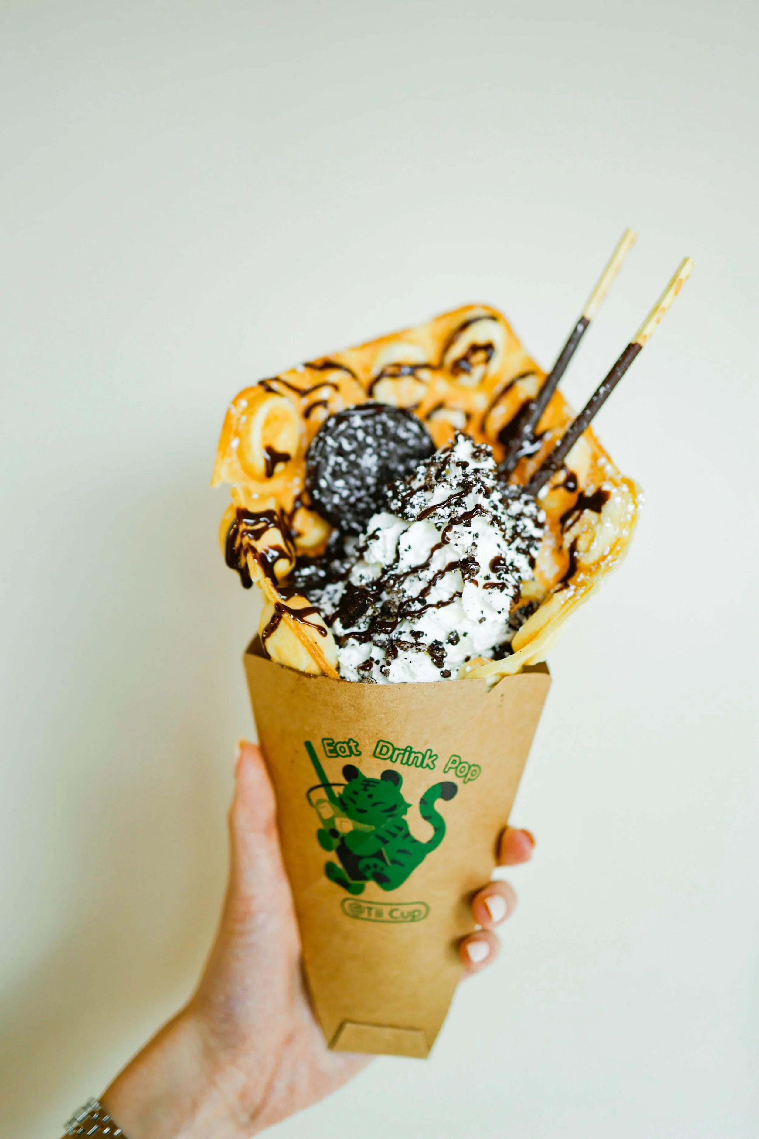 An original bubble waffle with Oreo cookies, whipped cream, pocky, more Oreo, and chocolate drizzle